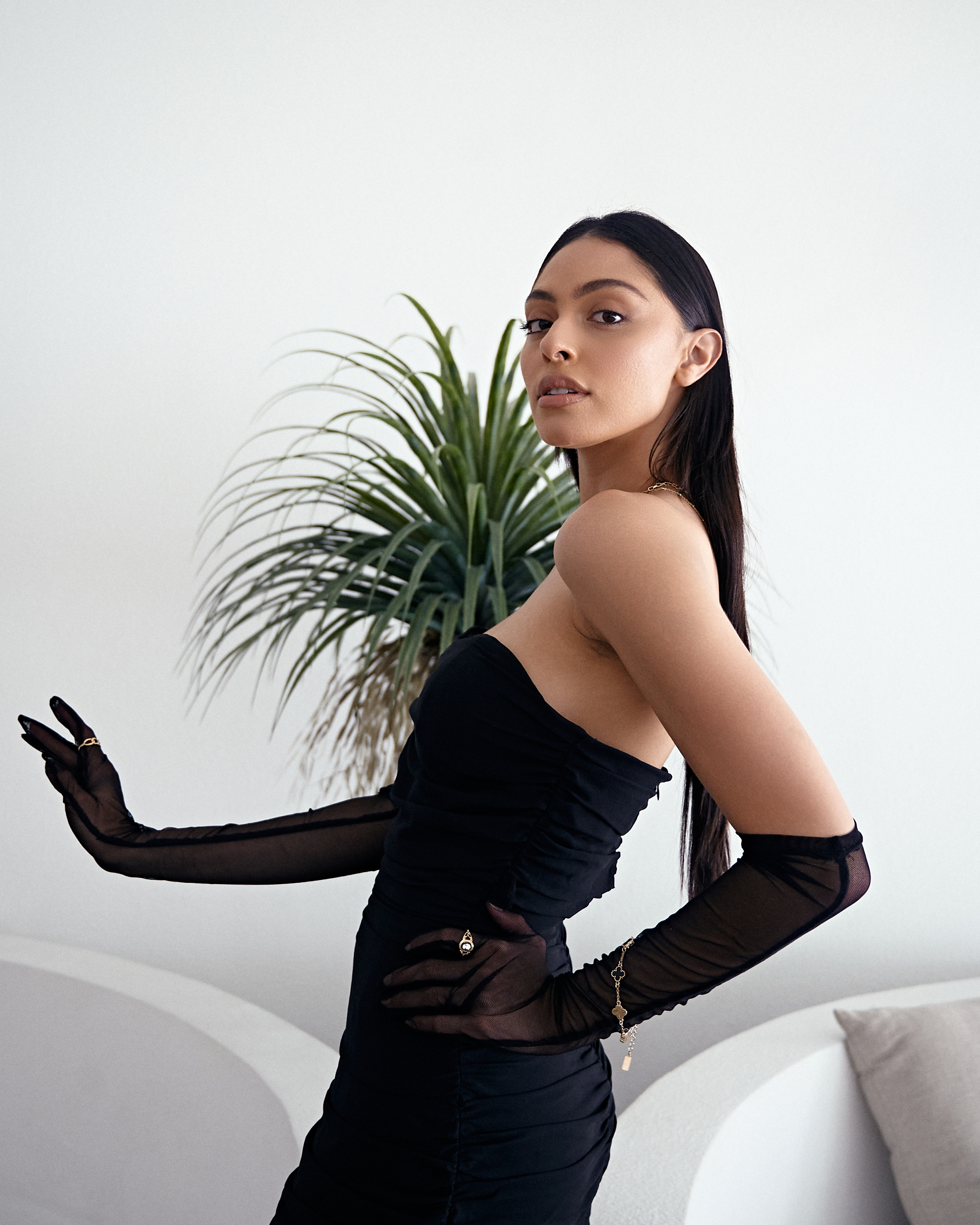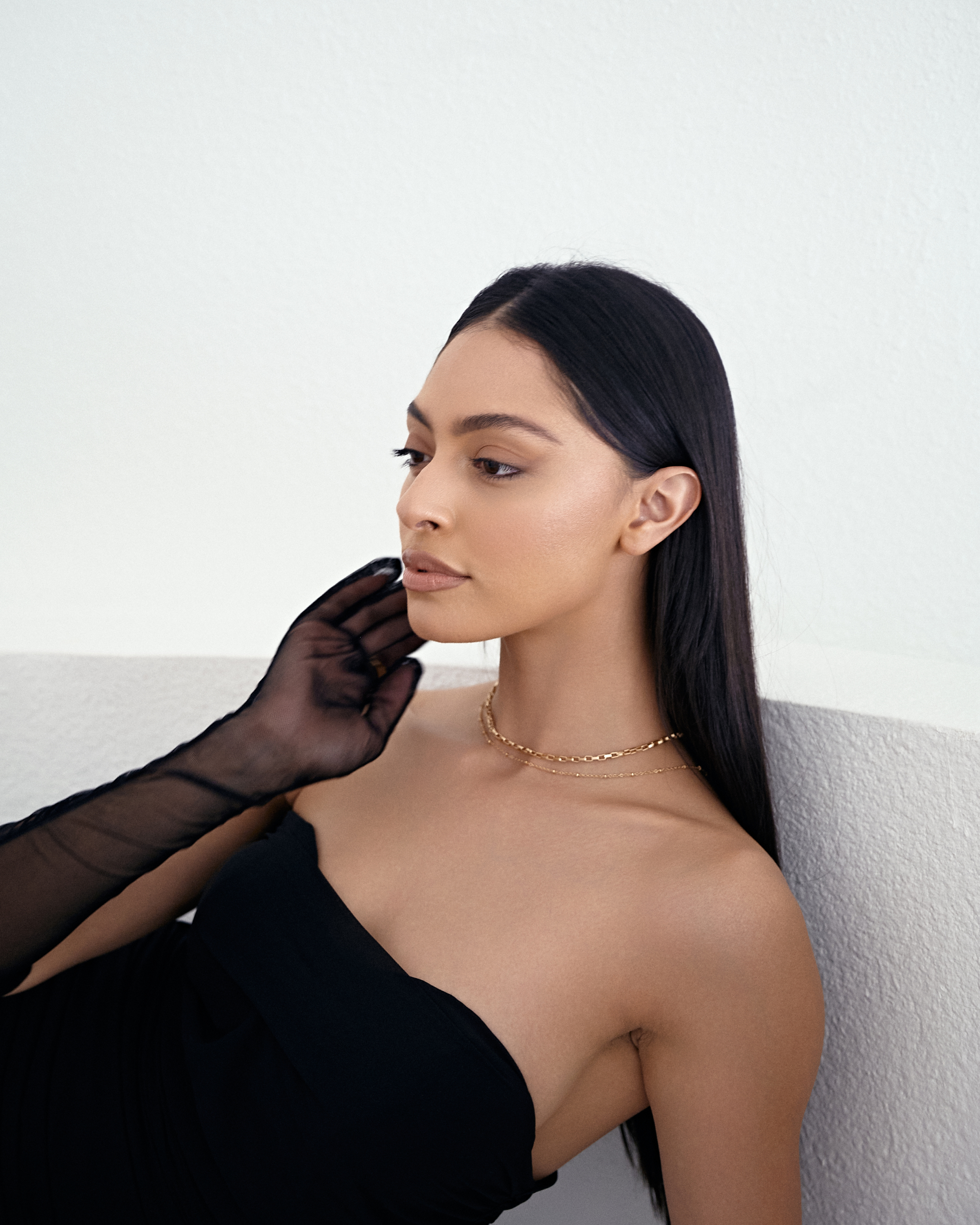 Strapless Ruched Maxi Dress with Sheer Gloves – Black