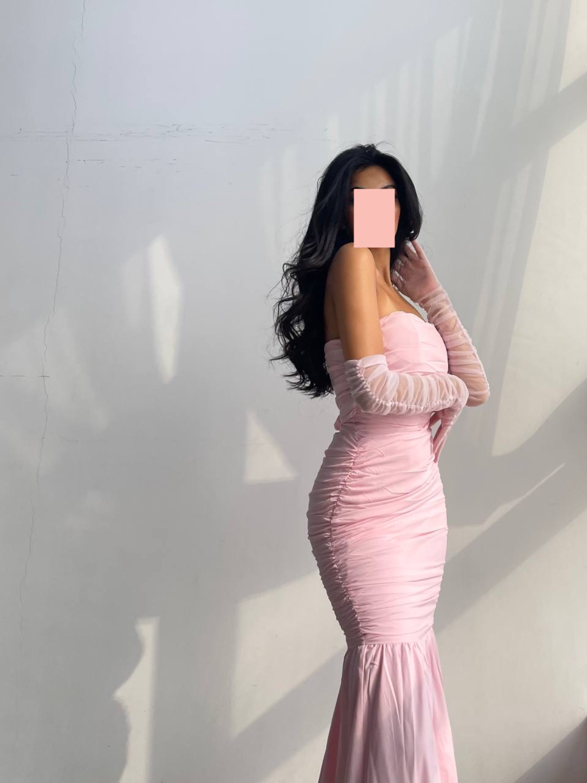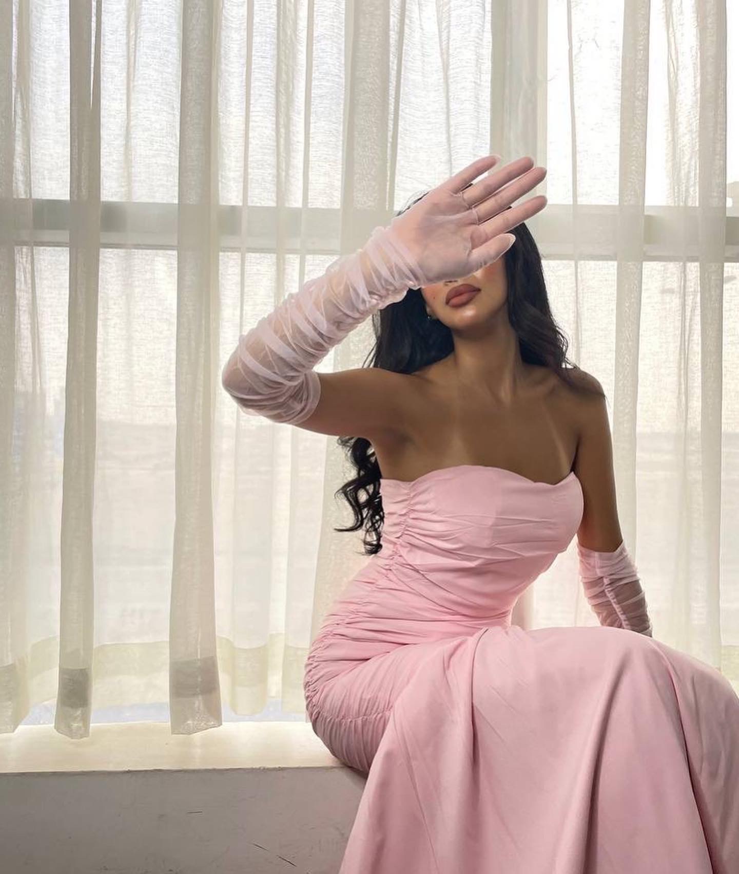 Strapless Ruched Maxi Dress with Sheer Gloves – Blush Pink
